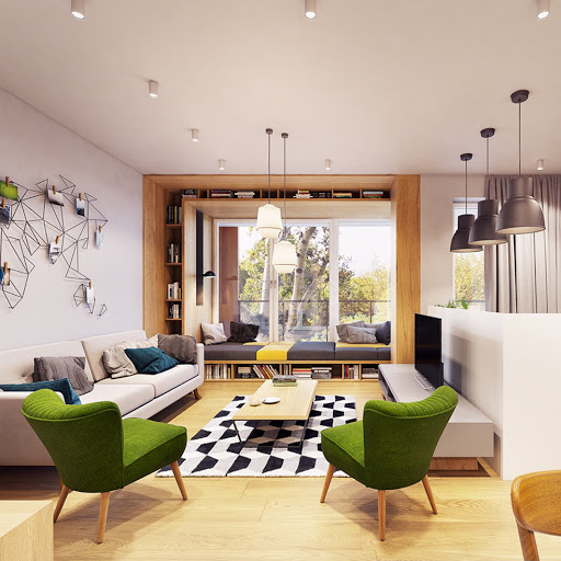 Thay vì dùng tường ngăn như thông thường, các kiến trúc sư Đào Hưng, Liêm Nguyễn, Lê Hoàng (AHL Architects) quyết định dùng hệ thống tủ đồ để phân chia ước lệ các không gian sử dụng cho 2 phòng ngủ, bếp, ăn, sinh hoạt chung.